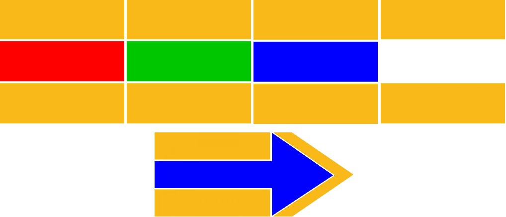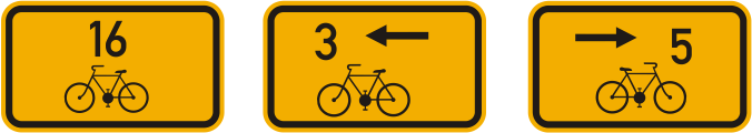Last but not least haben wir hier Geländemarkierungen. Radwege, die hauptsächlich auf Feld- oder Forststraßen oder im Gelände führen, können mit 14 × 14 cm langen Fahrspurmarkierungen gekennzeichnet sein, die gelbe äußere Fahrspuren aufweisen und die mittlere ist rot, blau, grün oder weiß. Sie können auch durch einen Pfeil ergänzt werden.
